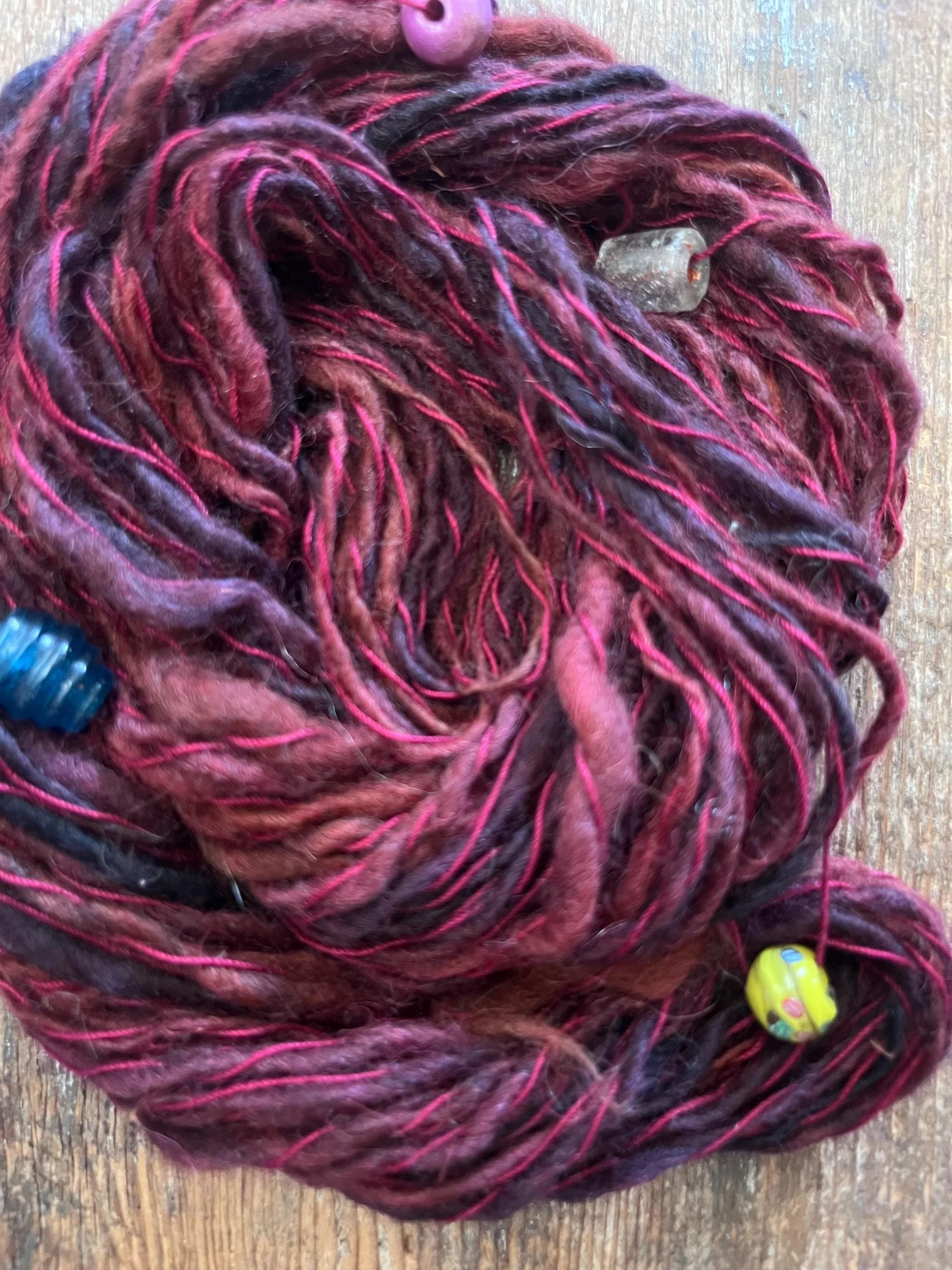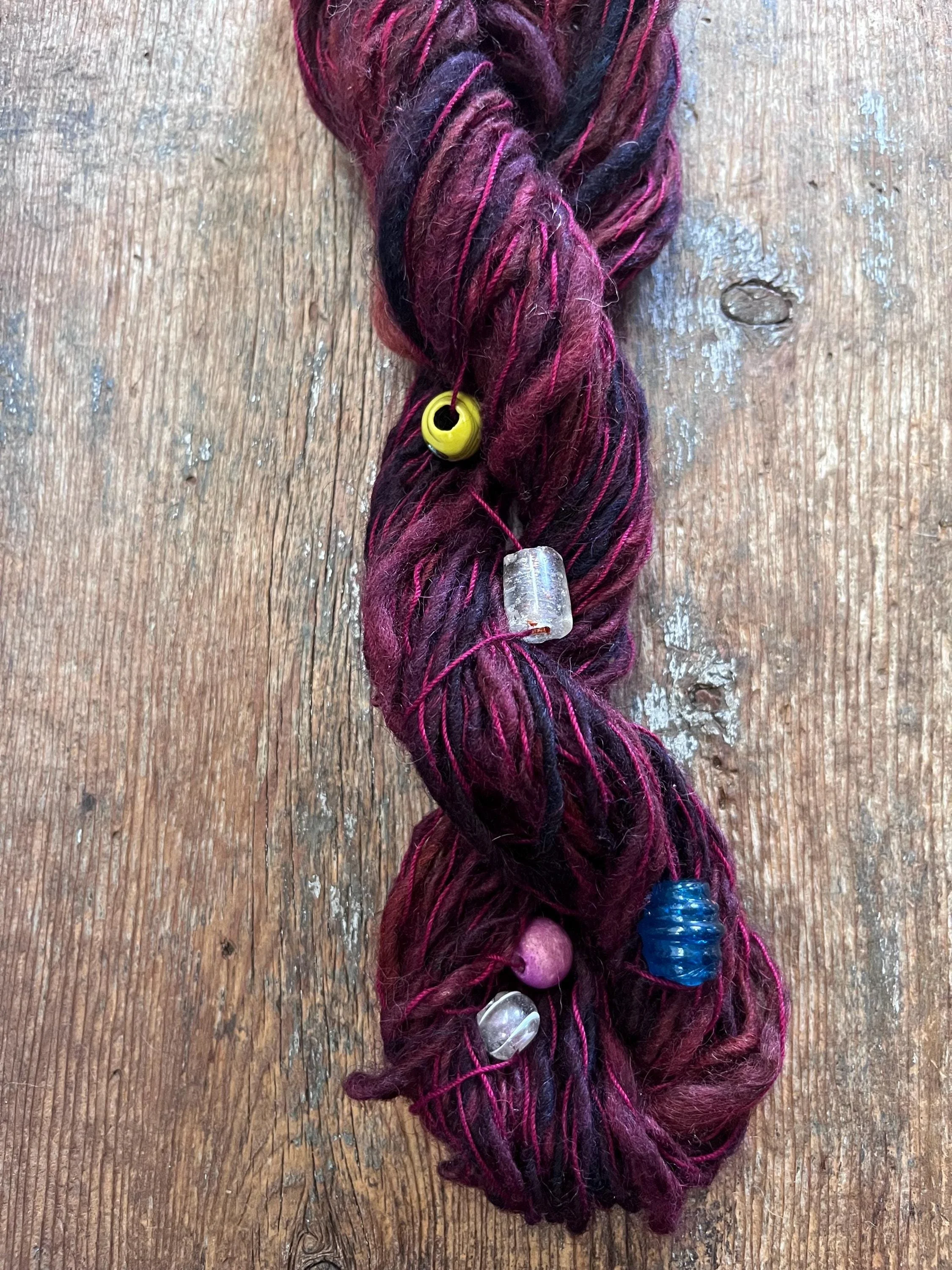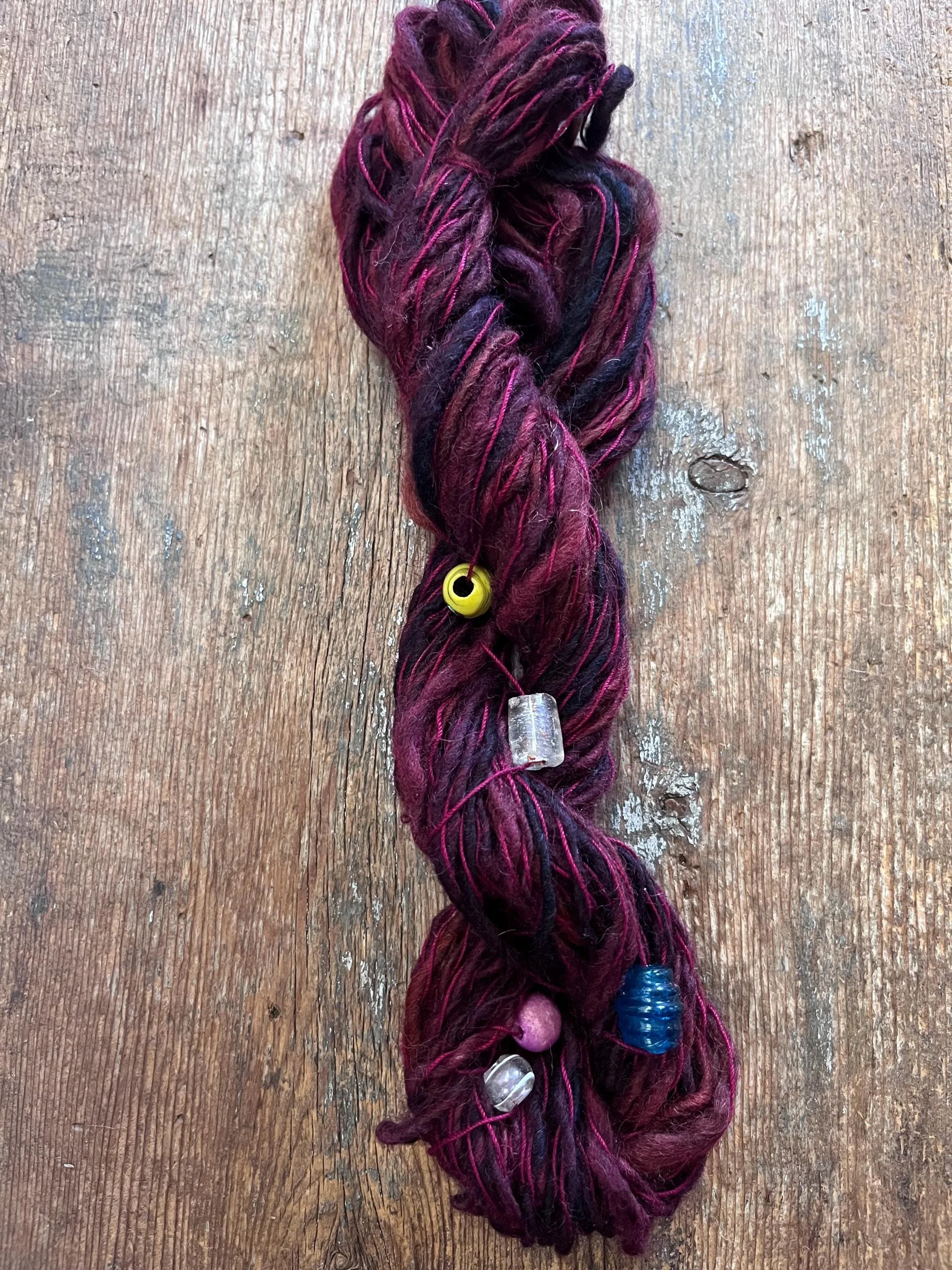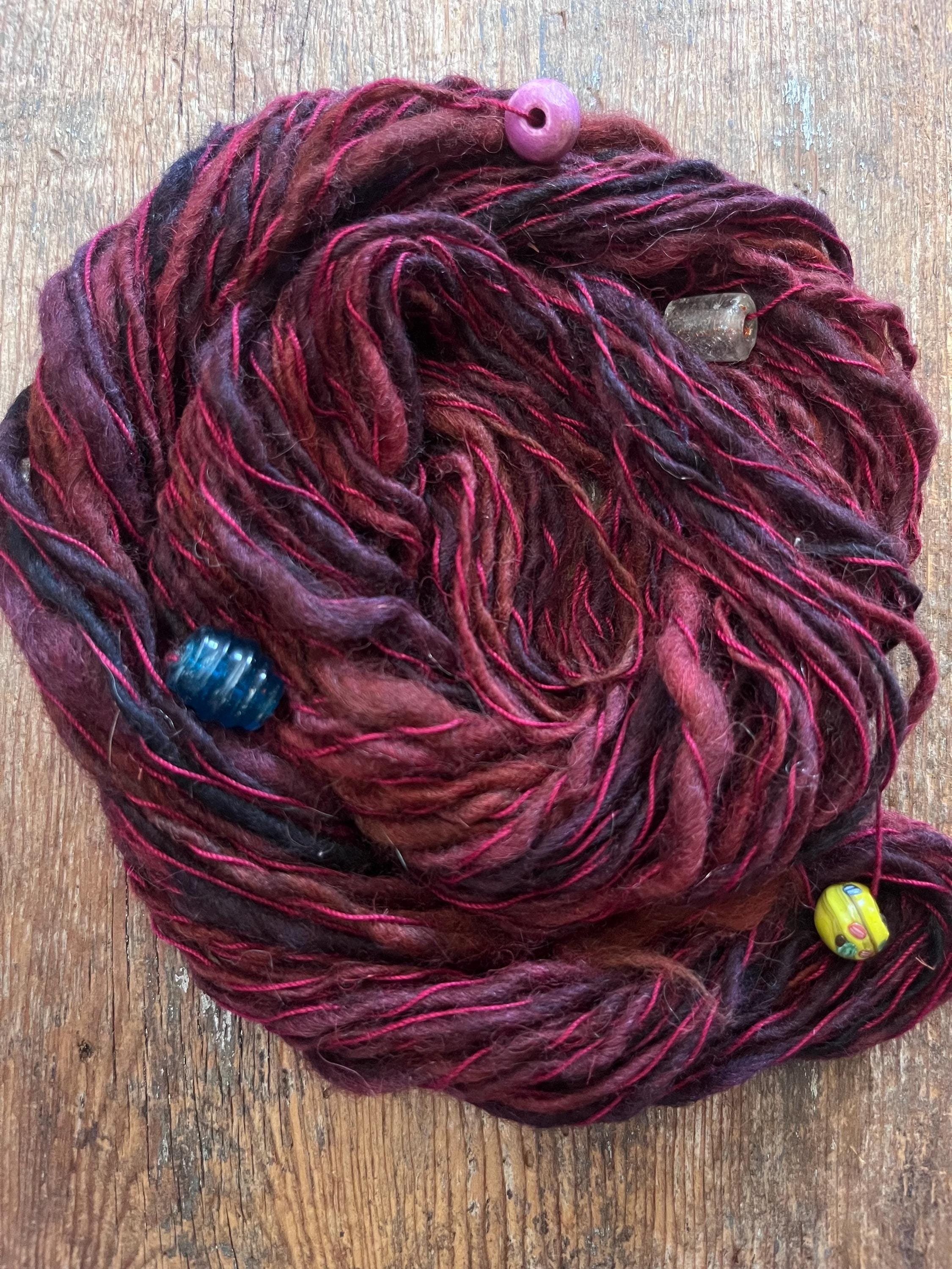 Beaded burgundy art yarn, 50 yards handspun yarn