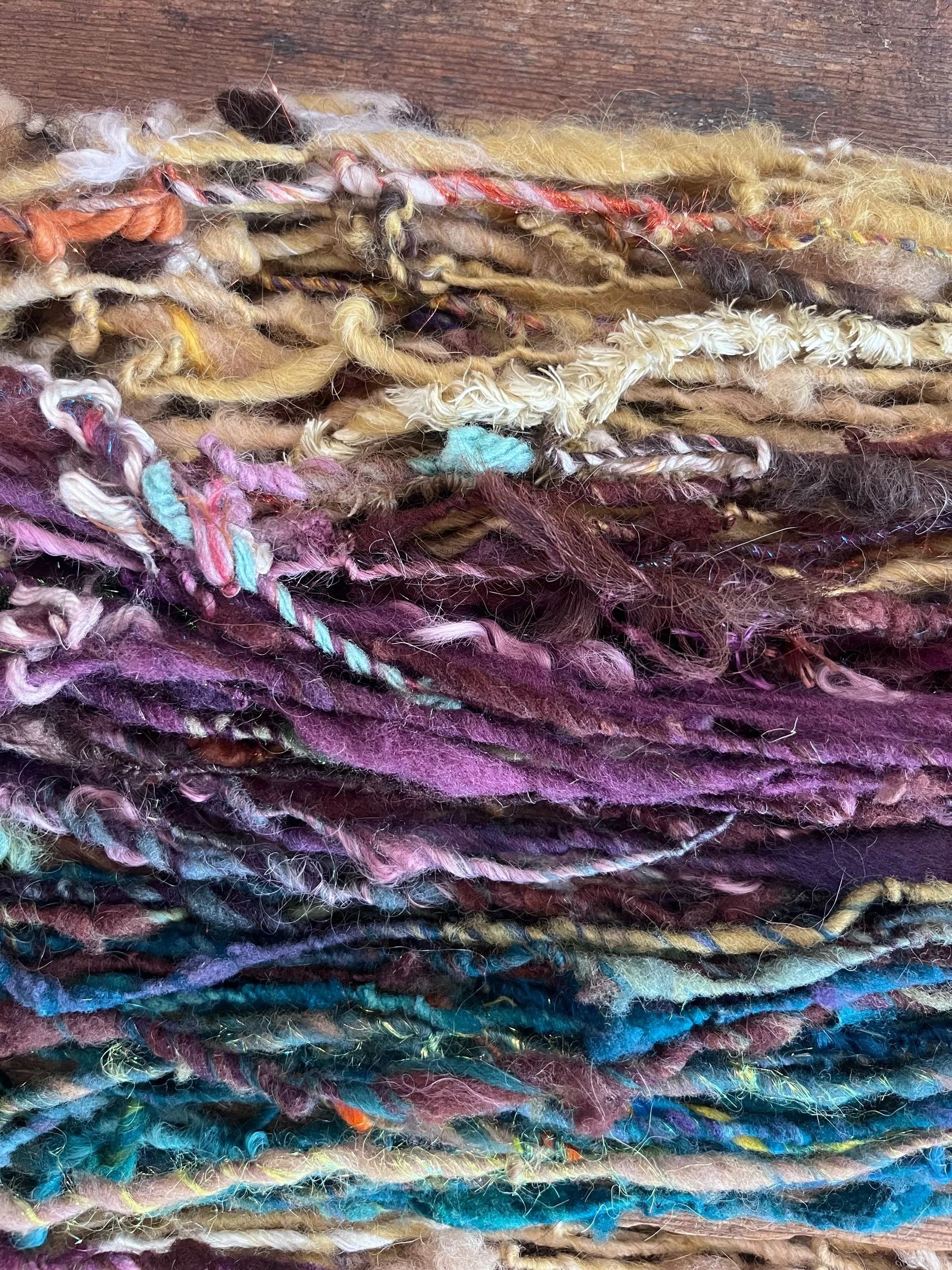 Scrumptious, scrappy handspun self striping yarn, 38 yards