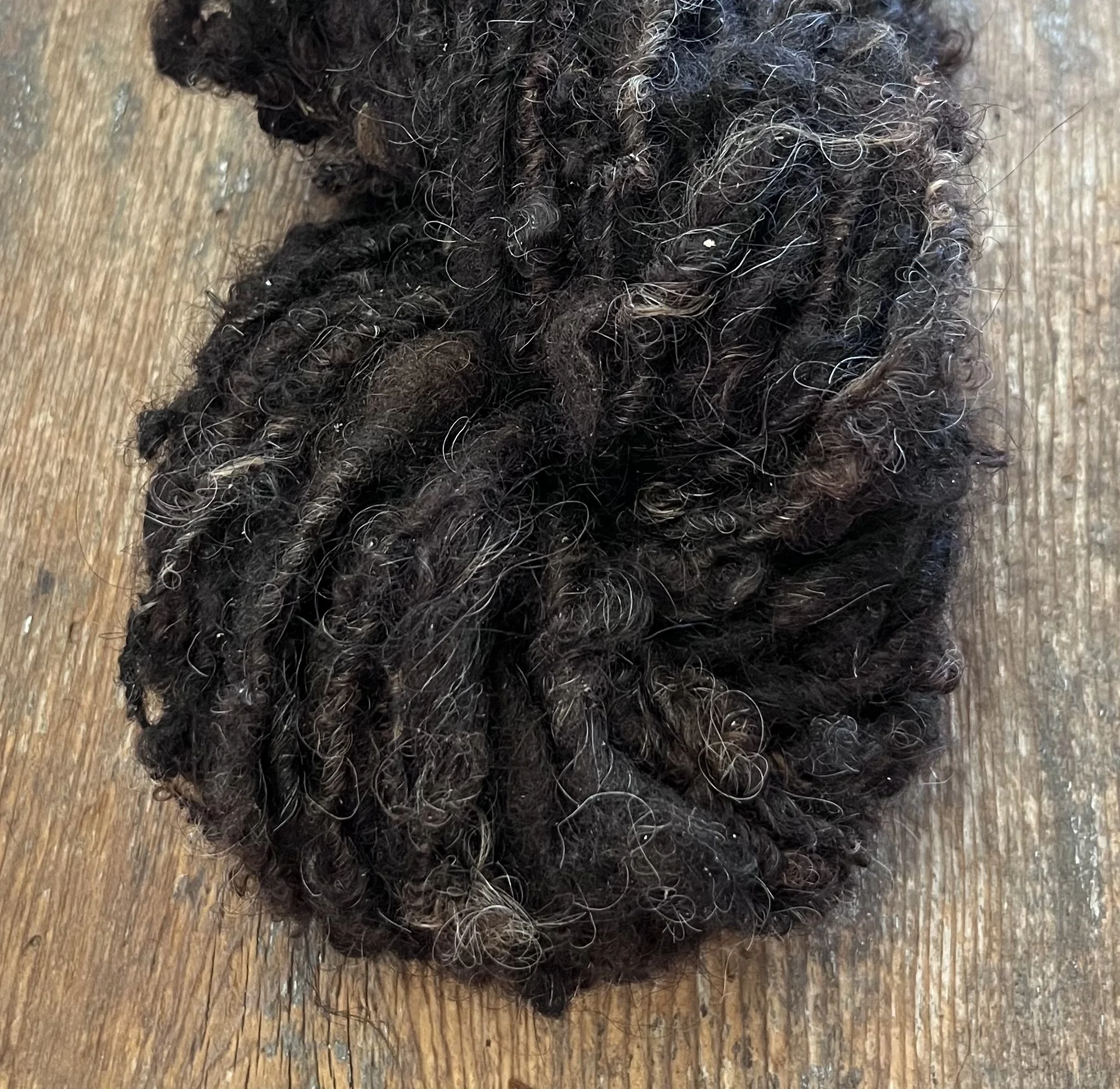 Dark brown finnsheep handspun yarn, soft, with curly tan tips