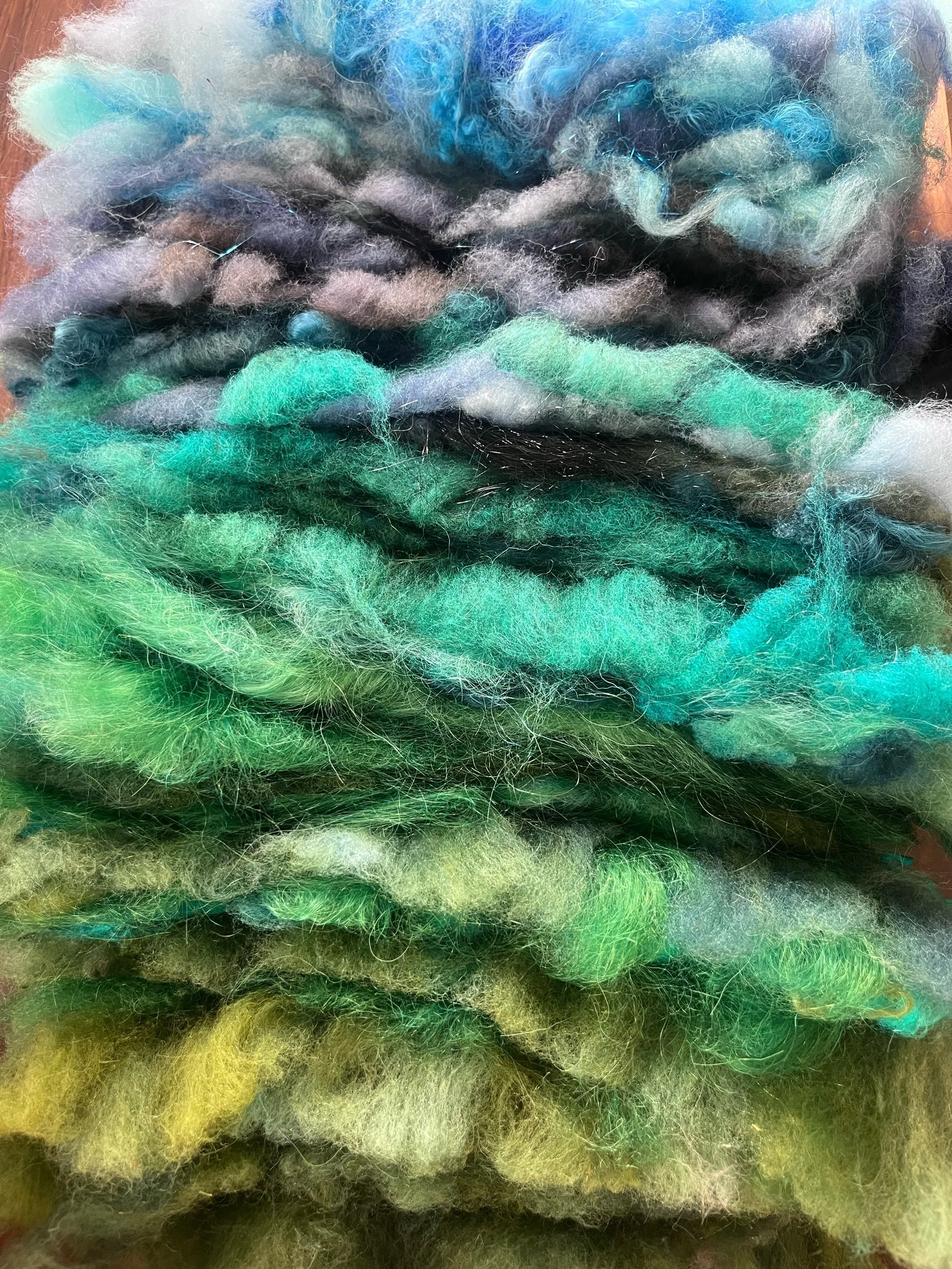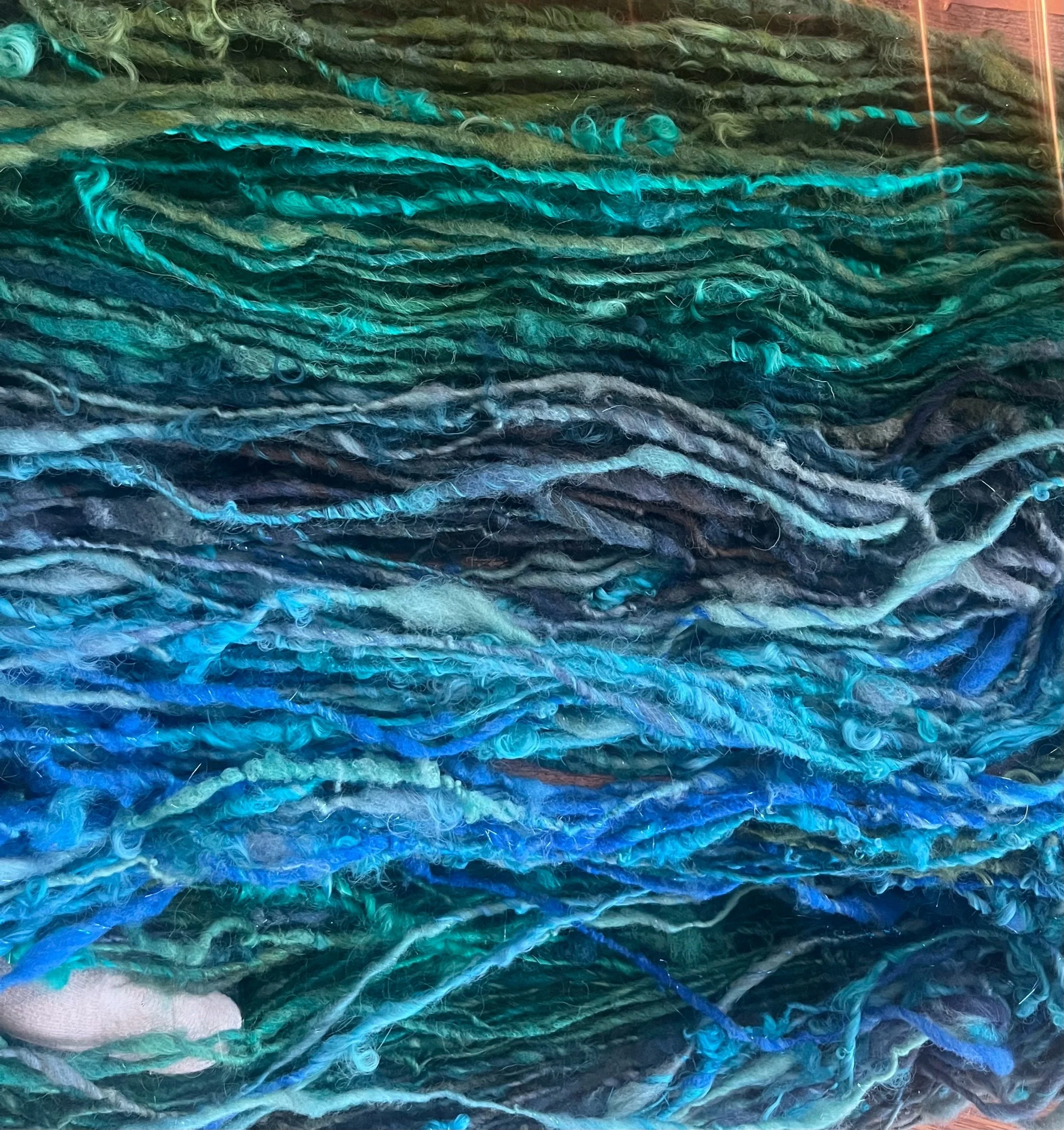 Creating handspun color gradient yarns is my current obsession! I use a blending board to create a series of art batts with my own hand dyed fibers, and vary the colors slightly with each batt, to make a unique and texture-filled, one of a kind color gradient art yarn! This skein is single ply, light bulky weight, and generally trends through a variety of blues, teals and greens. Fiber blend is everything! multiple kinds of wool, mohair, alpaca, angora, silk, bamboo, sari silk, eucalyptus fiber and probably more. 300 yards. this is a large gorgeous skein and is perfect for your weaving, crochet, knitting, basketry or any other fiber arts project.